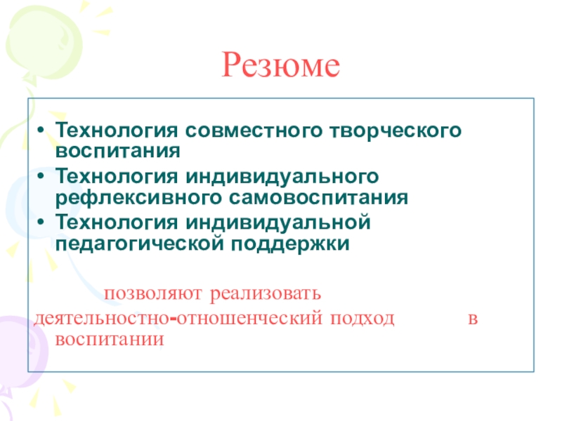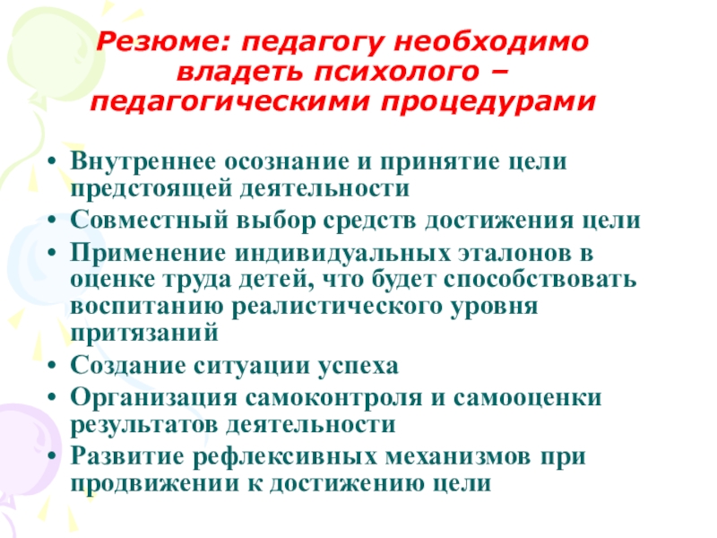 Слайд 16Резюме: педагогу необходимо владеть психолого – педагогическими процедурами