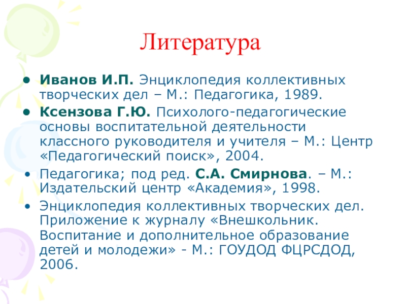 Иванов И.П. Энциклопедия коллективных творческих дел – М.: Педагогика, 1989.