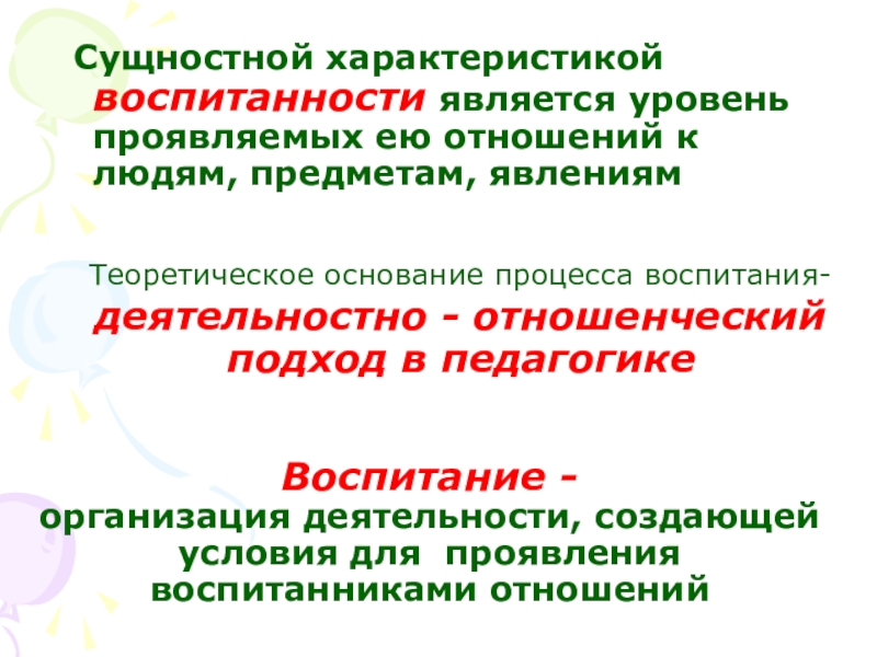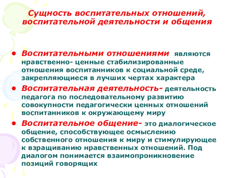 Слайд 10Сущность воспитательных отношений, воспитательной деятельности и общения