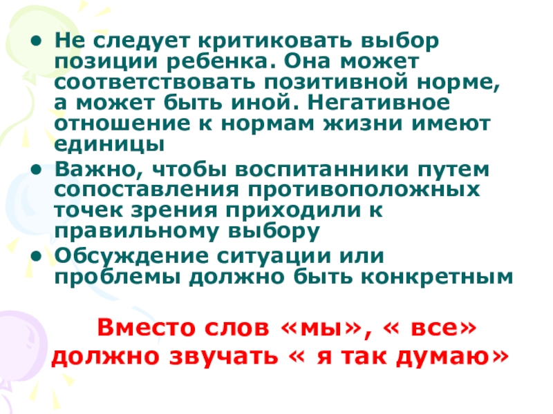 Слайд 23Не следует критиковать выбор позиции ребенка. Она может соответствовать позитивной норме,