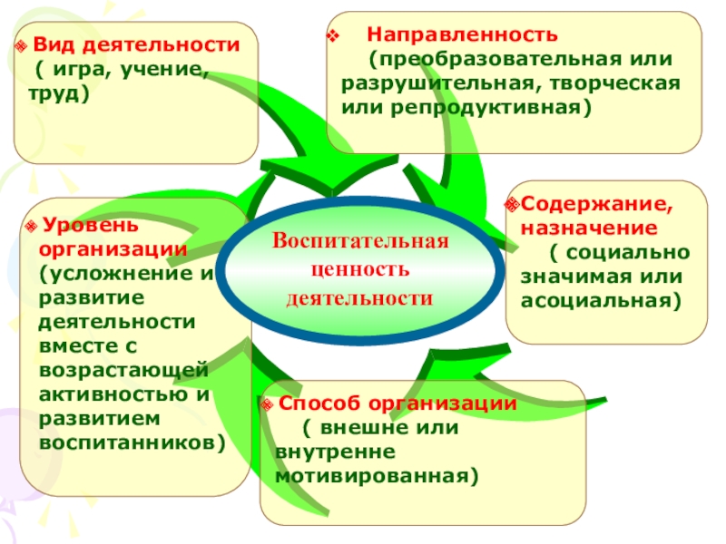 Воспитательная деятельность- деятельность педагога по последовательному развитию совокупности педагогически ценных отношений воспитанников к окружающему миру