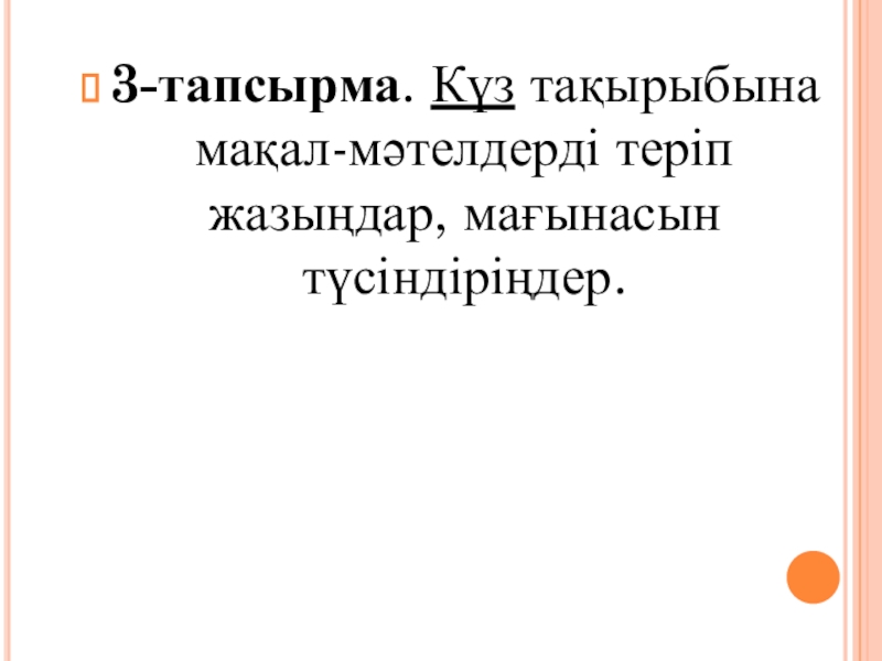 Слайд 73-тапсырма. Күз тақырыбына мақал-мәтелдерді теріп жазыңдар, мағынасын түсіндіріңдер.