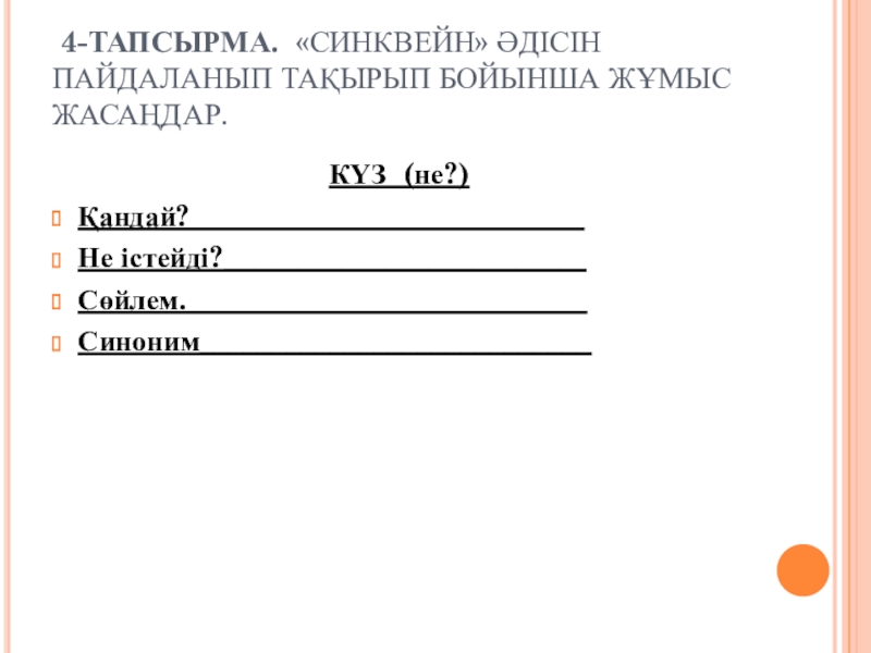 Слайд 8 4-ТАПСЫРМА. «СИНКВЕЙН» ӘДІСІН ПАЙДАЛАНЫП ТАҚЫРЫП БОЙЫНША ЖҰМЫС ЖАСАҢДАР.