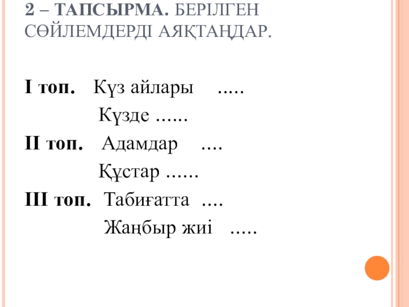 2 – ТАПСЫРМА. БЕРІЛГЕН СӨЙЛЕМДЕРДІ АЯҚТАҢДАР. І топ.  Күз айлары  .....