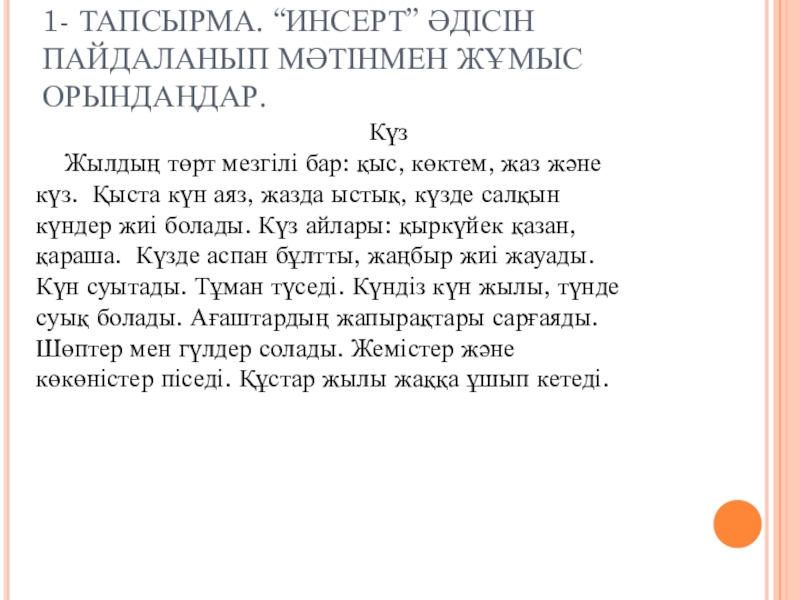 1- ТАПСЫРМА. “ИНСЕРТ” ӘДІСІН ПАЙДАЛАНЫП МӘТІНМЕН ЖҰМЫС ОРЫНДАҢДАР.Күз   Жылдың төрт мезгілі бар: қыс, көктем, жаз