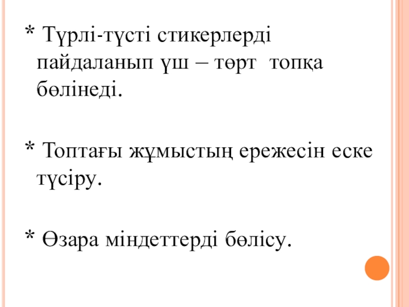 Слайд 2* Түрлі-түсті стикерлерді пайдаланып үш – төрт топқа бөлінеді.