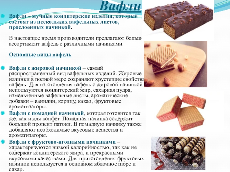Вафли – мучные кондитерские изделия, которые состоят из нескольких вафельных листов, прослоенных начинкой.