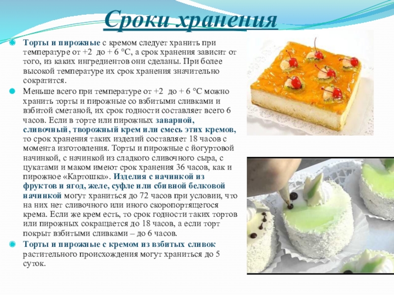 Торты и пирожные можно хранить вместе с другими кондитерскими изделиями и десертами, но недопустимо их хранение с мясными изделиями, сырами, рыбой и другими продуктами, особенно имеющими резкий запах.