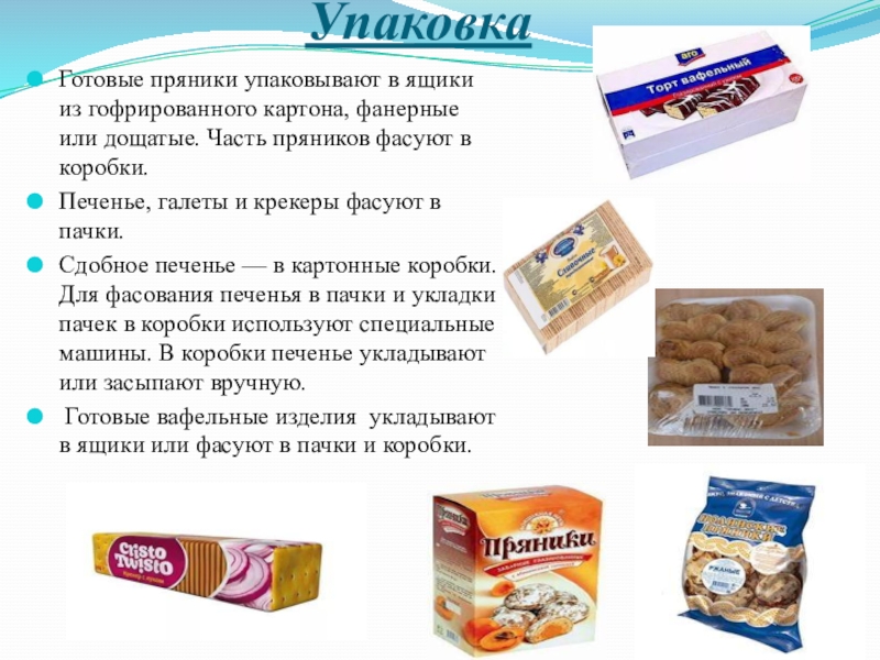 Готовые пряники упаковывают в ящики из гофрированного картона, фанерные или дощатые. Часть пряников фасуют в коробки.