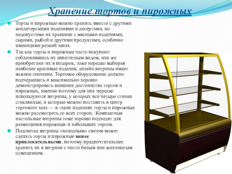 Подсветка витрины «холодным» светом может сделать торты и пирожные менее привлекательными, поэтому предпочтительнее хранить их в витрине с чисто белым или желтоватым освещением.