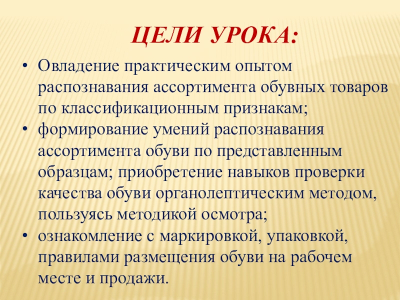 Овладение практическим опытом распознавания ассортимента обувных товаров по классификационным признакам;