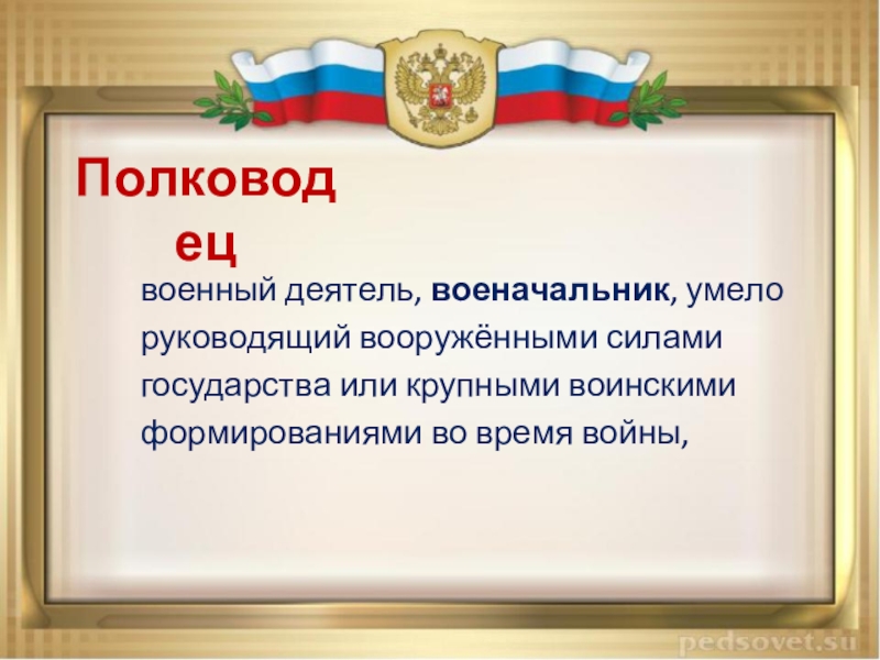военный деятель, военачальник, умело руководящий вооружёнными силами государства или крупными воинскими