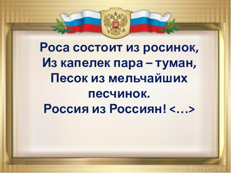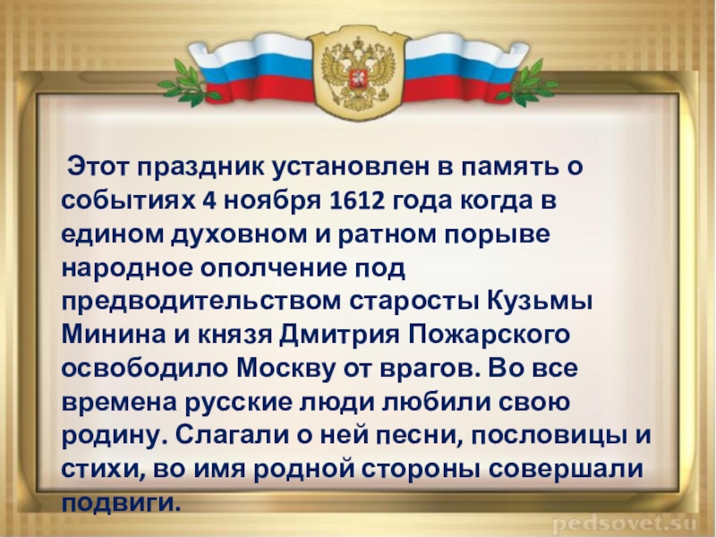 года когда в едином духовном и ратном порыве народное ополчение под предводительством старосты Кузьмы Минина и князя Дмитрия Пожарского освободило Москву от врагов. Во все времена русские люди любили свою родину. Слагали о ней песни, пословицы и стихи, во имя родной стороны совершали подвиги.