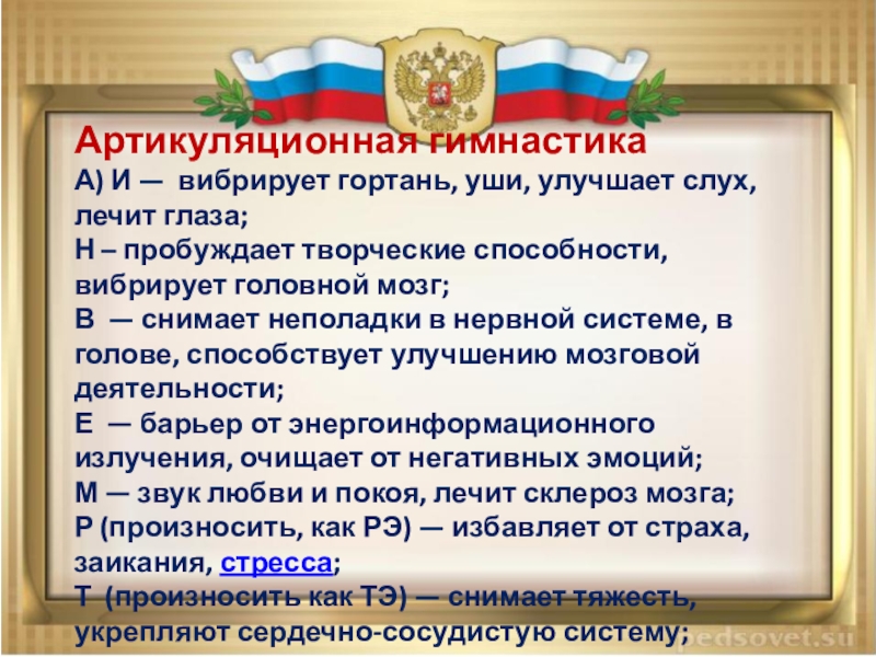 А) И — вибрирует гортань, уши, улучшает слух, лечит глаза;
