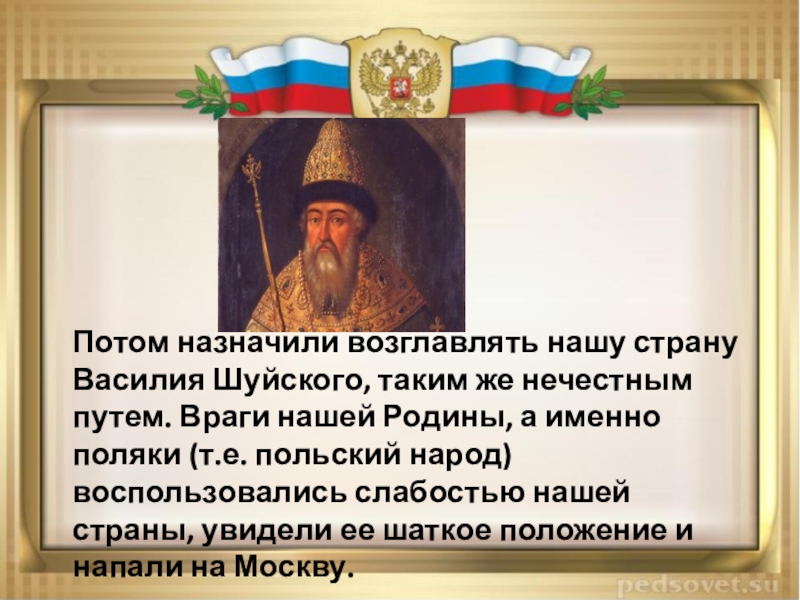 Слайд 13Потом назначили возглавлять нашу страну Василия Шуйского, таким же нечестным путем.