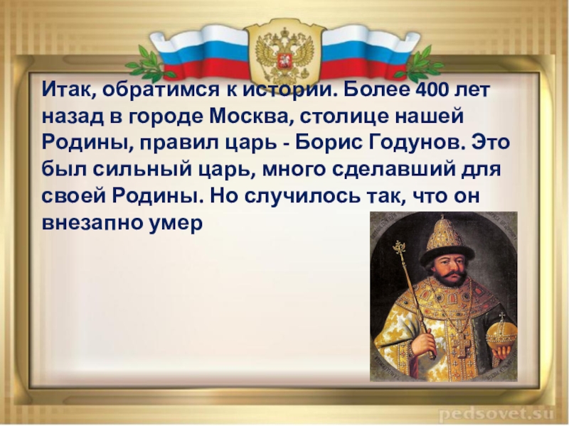 столице нашей Родины, правил царь - Борис Годунов. Это был сильный царь, много сделавший для своей Родины. Но случилось так, что он внезапно умер