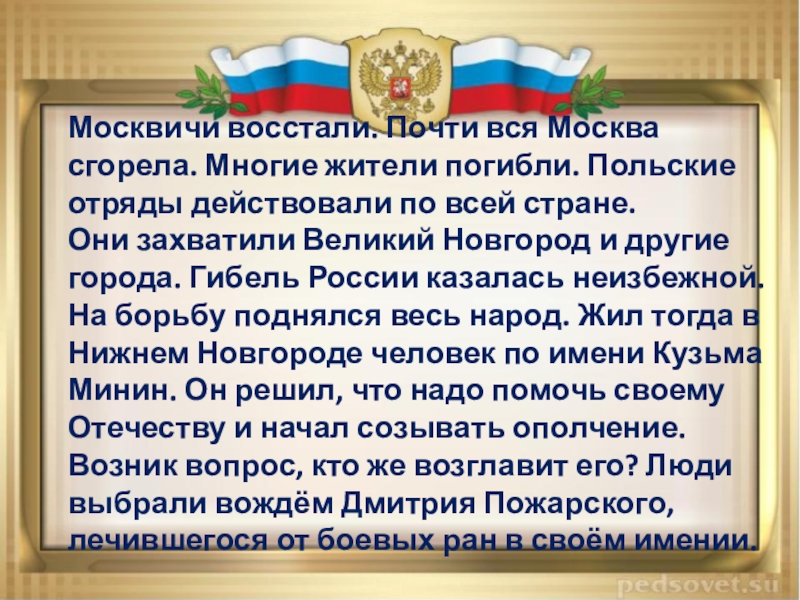 Они захватили Великий Новгород и другие города. Гибель России казалась неизбежной. На борьбу поднялся весь народ. Жил тогда в Нижнем Новгороде человек по имени Кузьма Минин. Он решил, что надо помочь своему Отечеству и начал созывать ополчение. Возник вопрос, кто же возглавит его? Люди выбрали вождём Дмитрия Пожарского, лечившегося от боевых ран в своём имении.