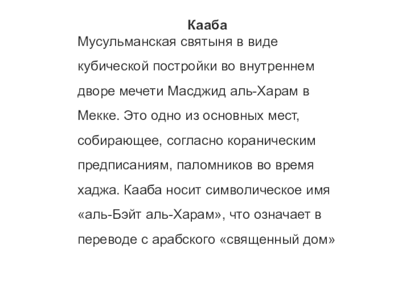 аль-Харам в Мекке. Это одно из основных мест, собирающее, согласно кораническим предписаниям, паломников во время хаджа. Кааба носит символическое имя «аль-Бэйт аль-Харам», что означает в переводе с арабского «священный дом»