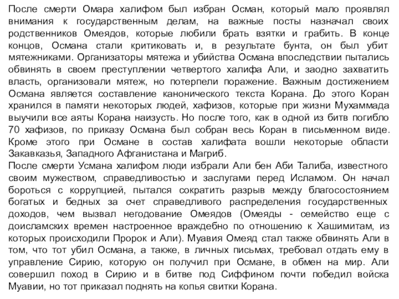 к государственным делам, на важные посты назначал своих родственников Омеядов, которые любили брать взятки и грабить. В конце концов, Османа стали критиковать и, в результате бунта, он был убит мятежниками. Организаторы мятежа и убийства Османа впоследствии пытались обвинять в своем преступлении четвертого халифа Али, и заодно захватить власть, организовали мятеж, но потерпели поражение. Важным достижением Османа является составление канонического текста Корана. До этого Коран хранился в памяти некоторых людей, хафизов, которые при жизни Мухаммада выучили все аяты Корана наизусть. Но после того, как в одной из битв погибло 70 хафизов, по приказу Османа был собран весь Коран в письменном виде. Кроме этого при Османе в состав халифата вошли некоторые области Закавказья, Западного Афганистана и Магриб.