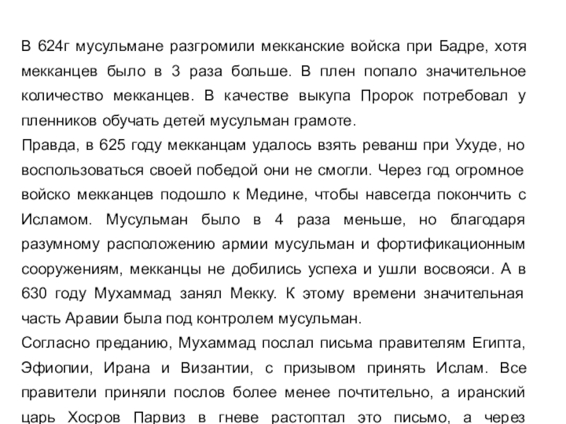 Слайд 13В 624г мусульмане разгромили мекканские войска при Бадре, хотя мекканцев было