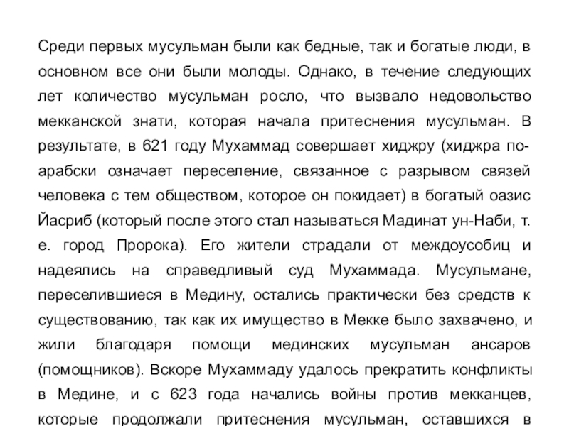 основном все они были молоды. Однако, в течение следующих лет количество мусульман росло, что вызвало недовольство мекканской знати, которая начала притеснения мусульман. В результате, в 621 году Мухаммад совершает хиджру (хиджра по-арабски означает переселение, связанное с разрывом связей человека с тем обществом, которое он покидает) в богатый оазис Йасриб (который после этого стал называться Мадинат ун-Наби, т.е. город Пророка). Его жители страдали от междоусобиц и надеялись на справедливый суд Мухаммада. Мусульмане, переселившиеся в Медину, остались практически без средств к существованию, так как их имущество в Мекке было захвачено, и жили благодаря помощи мединских мусульман ансаров (помощников). Вскоре Мухаммаду удалось прекратить конфликты в Медине, и с 623 года начались войны против мекканцев, которые продолжали притеснения мусульман, оставшихся в Мекке.