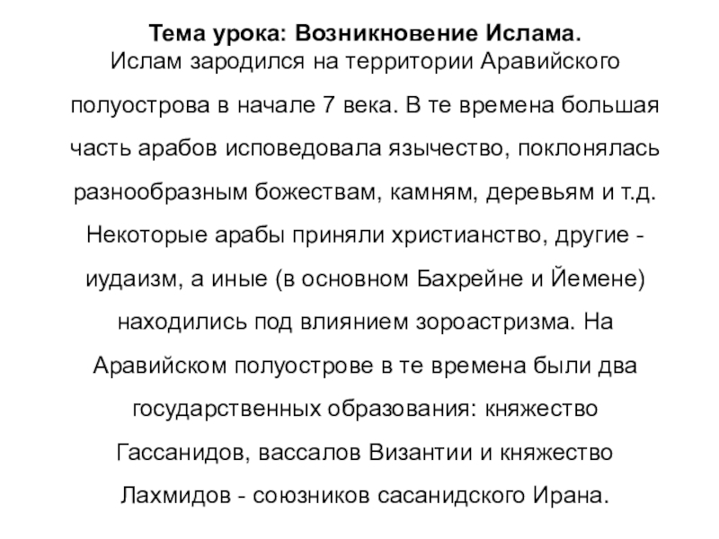 7 века. В те времена большая часть арабов исповедовала язычество, поклонялась разнообразным божествам, камням, деревьям и т.д. Некоторые арабы приняли христианство, другие - иудаизм, а иные (в основном Бахрейне и Йемене) находились под влиянием зороастризма. На Аравийском полуострове в те времена были два государственных образования: княжество Гассанидов, вассалов Византии и княжество Лахмидов - союзников сасанидского Ирана.