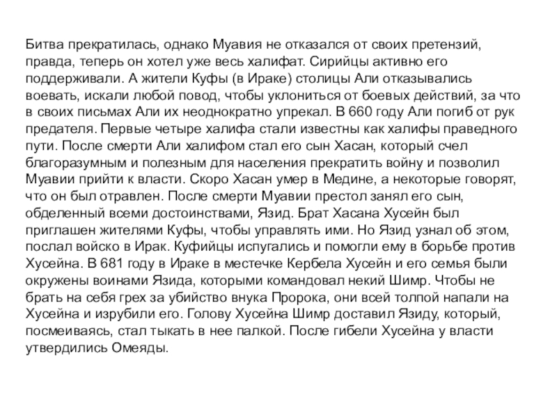 он хотел уже весь халифат. Сирийцы активно его поддерживали. А жители Куфы (в Ираке) столицы Али отказывались воевать, искали любой повод, чтобы уклониться от боевых действий, за что в своих письмах Али их неоднократно упрекал. В 660 году Али погиб от рук предателя. Первые четыре халифа стали известны как халифы праведного пути. После смерти Али халифом стал его сын Хасан, который счел благоразумным и полезным для населения прекратить войну и позволил Муавии прийти к власти. Скоро Хасан умер в Медине, а некоторые говорят, что он был отравлен. После смерти Муавии престол занял его сын, обделенный всеми достоинствами, Язид. Брат Хасана Хусейн был приглашен жителями Куфы, чтобы управлять ими. Но Язид узнал об этом, послал войско в Ирак. Куфийцы испугались и помогли ему в борьбе против Хусейна. В 681 году в Ираке в местечке Кербела Хусейн и его семья были окружены воинами Язида, которыми командовал некий Шимр. Чтобы не брать на себя грех за убийство внука Пророка, они всей толпой напали на Хусейна и изрубили его. Голову Хусейна Шимр доставил Язиду, который, посмеиваясь, стал тыкать в нее палкой. После гибели Хусейна у власти утвердились Омеяды.
