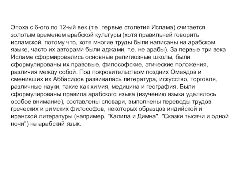 золотым временем арабской культуры (хотя правильней говорить исламской, потому что, хотя многие труды были написаны на арабском языке, часто их авторами были аджами, т.е. не арабы). За первые три века Ислама сформировались основные религиозные школы, были сформулированы их правовые, философские, этические положения, различия между собой. Под покровительством поздних Омеядов и сменивших их Аббасидов развивалась литература, искусство, торговля, различные науки, такие как химия, медицина и география. Были сформулированы правила арабского языка (изучению языка уделялось особое внимание), составлены словари, выполнены переводы трудов греческих и римских философов, некоторых образцов индийской и иранской литературы (например, "Калила и Димна", "Сказки тысячи и одной ночи") на арабский язык.