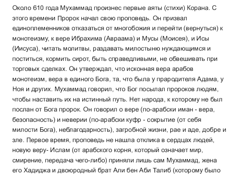 времени Пророк начал свою проповедь. Он призвал единоплеменников отказаться от многобожия и перейти (вернуться) к монотеизму, к вере Ибрахима (Авраама) и Мусы (Моисея), и Исы (Иисуса), читать молитвы, раздавать милостыню нуждающимся и поститься, кормить сирот, быть справедливыми, не обвешивать при торговых сделках. Он утверждал, что исконная вера арабов монотеизм, вера в единого Бога, та, что была у прародителя Адама, у Ноя и других. Мухаммад говорил, что Бог посылал пророков людям, чтобы наставить их на истинный путь. Нет народа, к которому не был послан от Бога пророк. Он говорил о вере (по-арабски иман - вера, безопасность) и неверии (по-арабски куфр - сокрытие (от себя милости Бога), неблагодарность), загробной жизни, рае и аде, добре и зле. Первое время, проповедь не нашла отклика в сердцах людей, новую веру- Ислам (от арабского корня, который означает мир, смирение, передача чего-либо) приняли лишь сам Мухаммад, жена его Хадиджа и двоюродный брат Али бен Аби Талиб (которому было тогда 9 лет), после к ним присоединился богатый купец Абу Бакр, и еще около 40 людей, ставшие ближайшими сподвижниками Пророка.