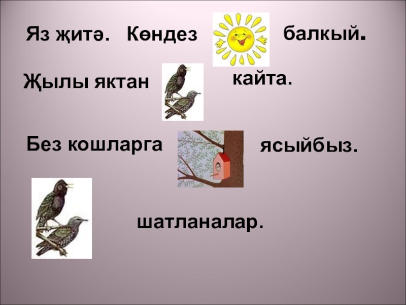 Яз җитә. Көндез Җылы яктан Без кошларга ясыйбыз. шатланалар.балкый.кайта.