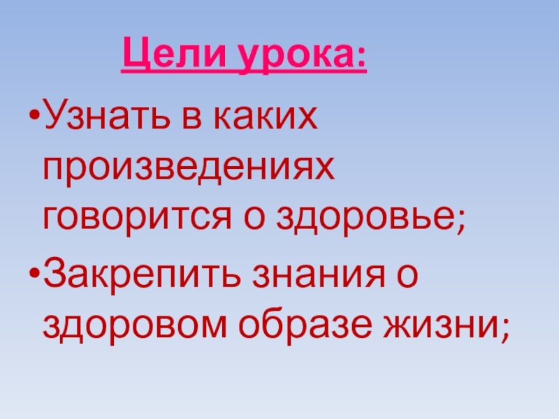 Цели урока: Узнать в каких произведениях говорится о здоровье;Закрепить знания о здоровом образе жизни;