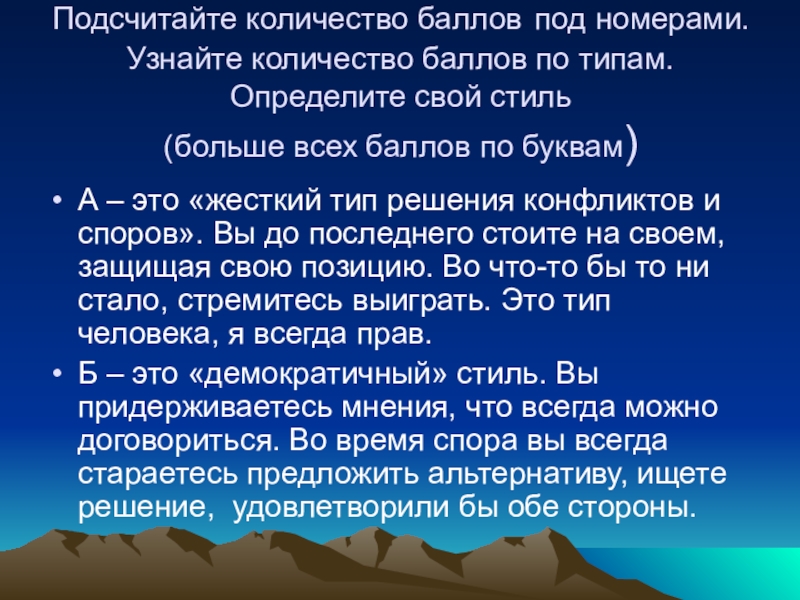 Б – это «демократичный» стиль. Вы придерживаетесь мнения, что всегда можно договориться. Во время спора вы всегда стараетесь предложить альтернативу, ищете решение, удовлетворили бы обе стороны.
