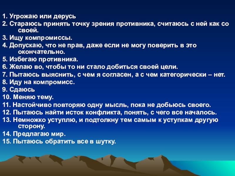 2. Стараюсь принять точку зрения противника, считаюсь с