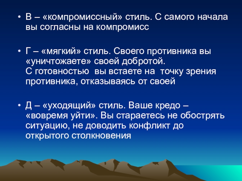 – «мягкий» стиль. Своего противника вы «уничтожаете» своей добротой. С готовностью вы встаете на точку зрения противника, отказываясь от своей