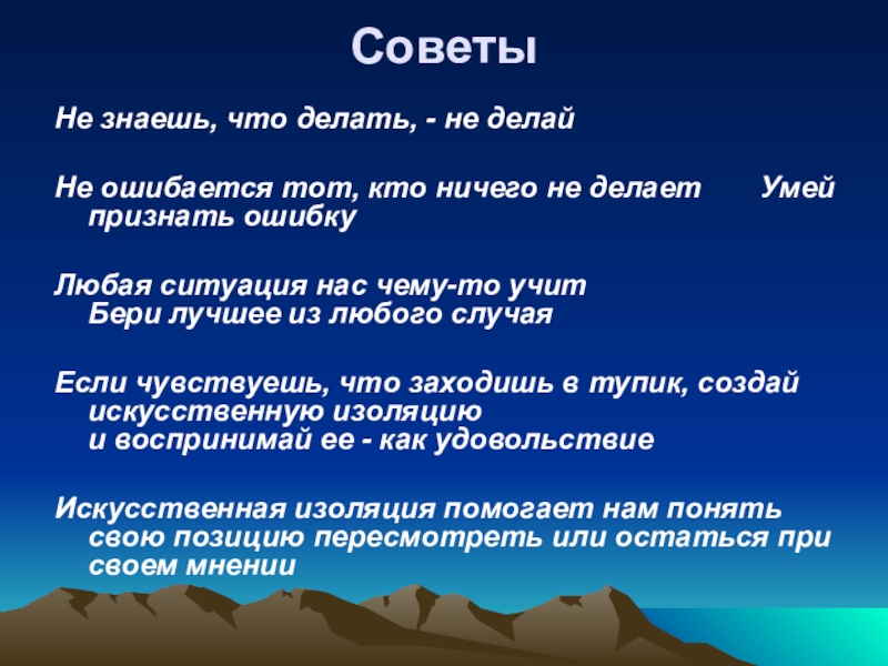 Если чувствуешь, что заходишь в тупик, создай искусственную изоляцию и воспринимай ее - как удовольствие