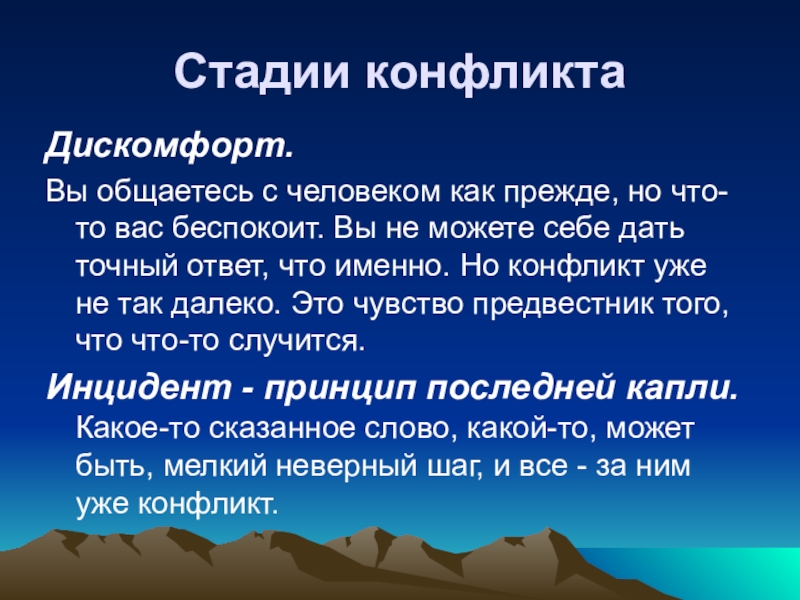 Инцидент - принцип последней капли. Какое-то сказанное слово, какой-то, может быть, мелкий неверный шаг, и все - за ним уже конфликт.