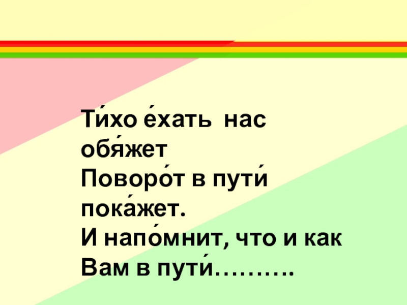 Ти́хо е́хать нас обя́жетПоворо́т в пути́ пока́жет.И напо́мнит, что и как Вам в пути́……….