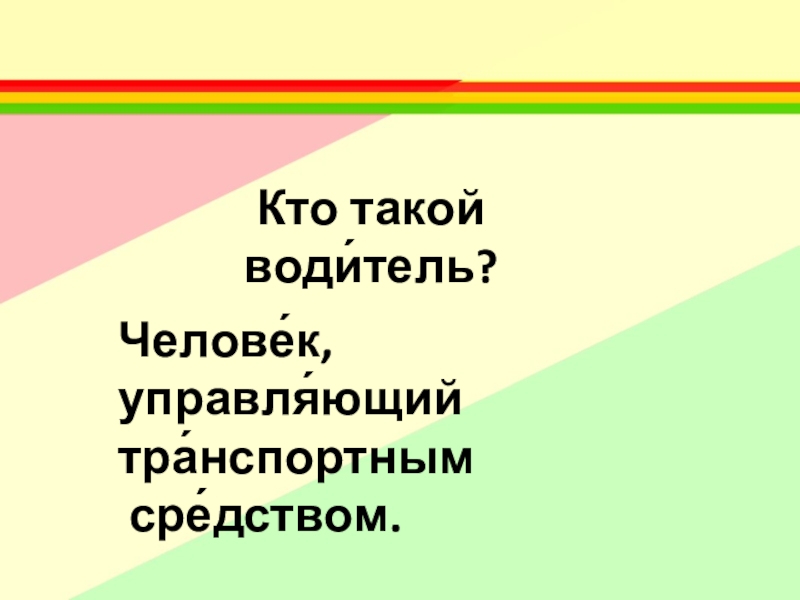 Кто такой води́тель?Челове́к, управля́ющий тра́нспортным сре́дством.
