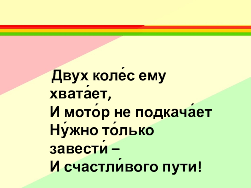 Двух коле́с ему хвата́ет,И мото́р не подкача́етНу́жно то́лько завести́ – И счастли́вого пути!