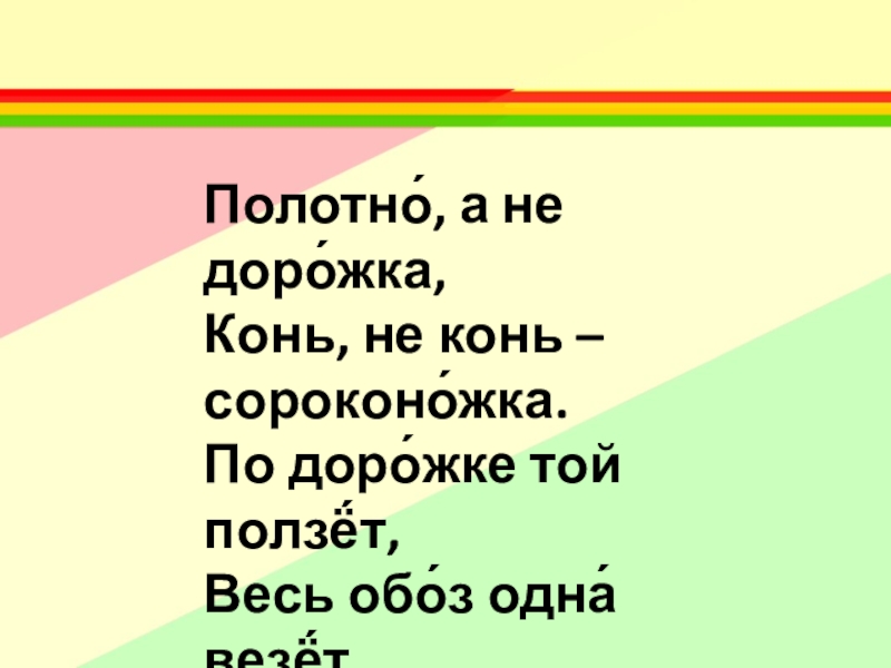 Полотно́, а не доро́жка,Конь, не конь – сороконо́жка.По доро́жке той ползё́т,Весь обо́з одна́ везё́т.