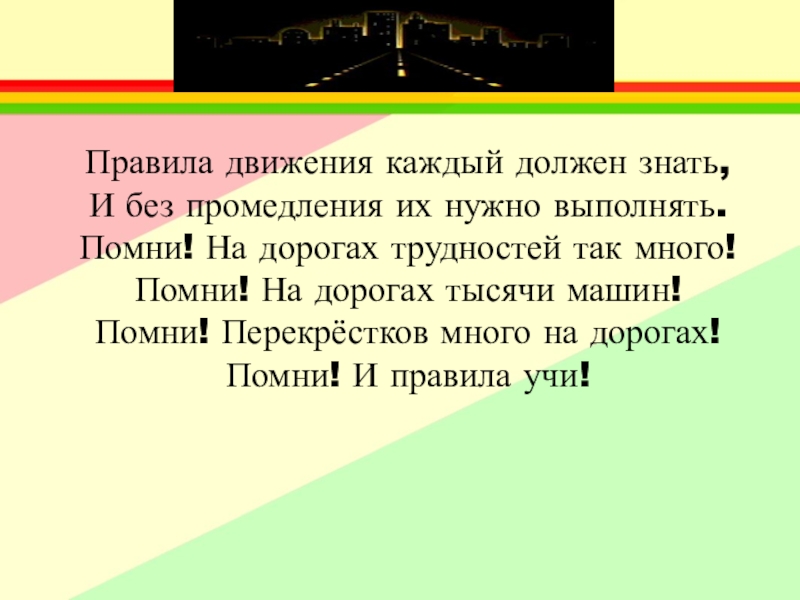 Правила движения каждый должен знать,И без промедления их нужно выполнять.Помни! На дорогах трудностей так много!Помни! На дорогах