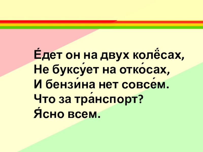 Е́дет он на двух колё́сах,Не буксу́ет на отко́сах,И бензи́на нет совсе́м.Что за тра́нспорт?Я́сно всем.