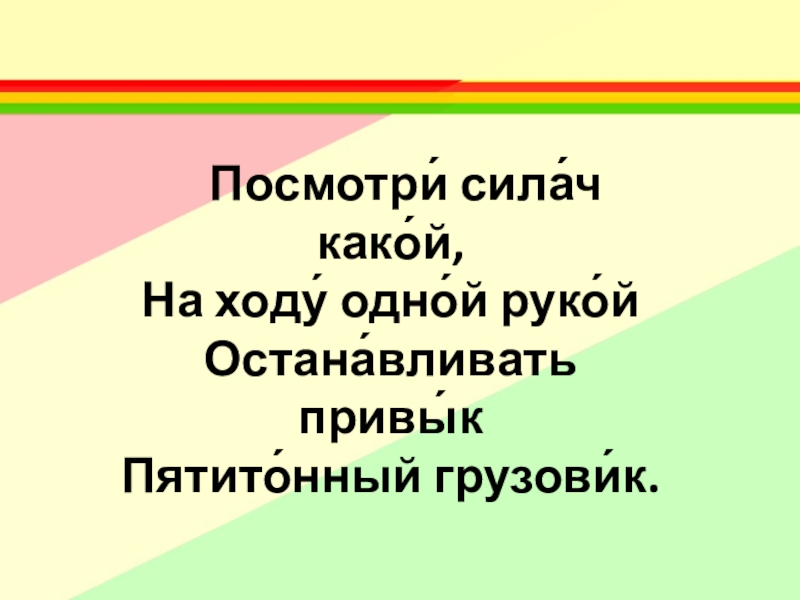 Посмотри́ сила́ч како́й,На ходу́ одно́й руко́йОстана́вливать привы́кПятито́нный грузови́к.