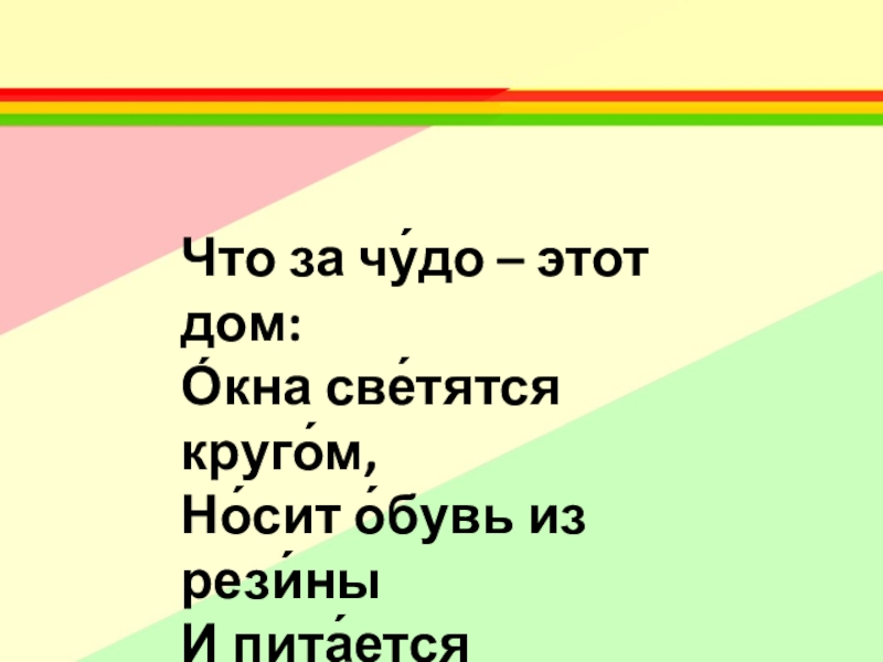 Что за чу́до – этот дом:О́кна све́тятся круго́м,Но́сит о́бувь из рези́ныИ пита́ется бензи́ном?