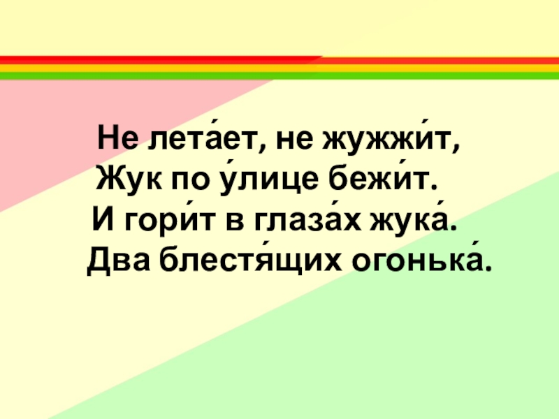 Слайд 12 Не лета́ет, не жужжи́т, Жук по у́лице бежи́т. И гори́т