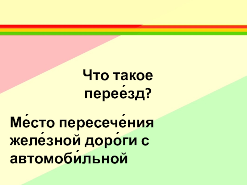 Что такое перее́зд?Ме́сто пересече́ния желе́зной доро́ги с автомоби́льной