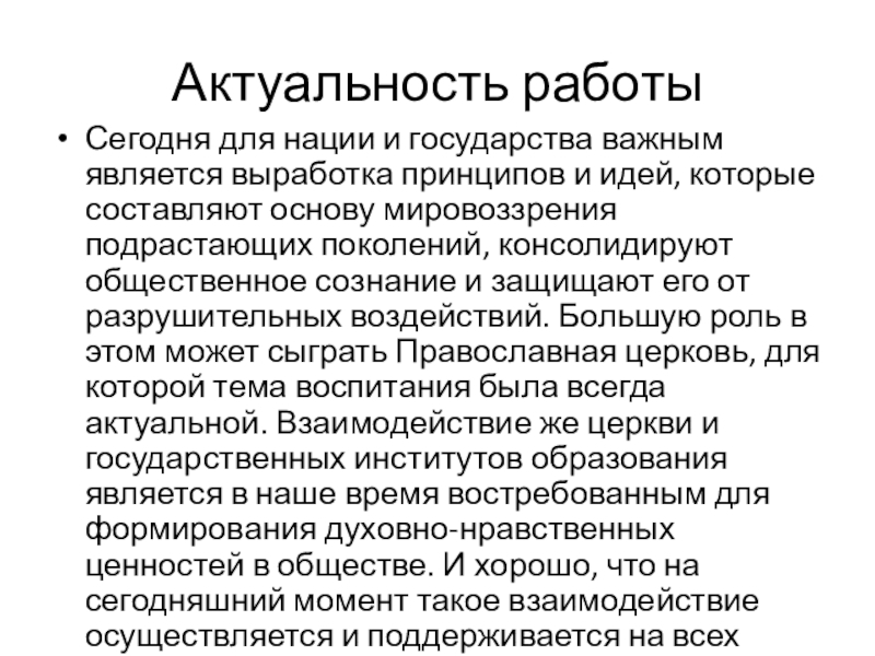 идей, которые составляют основу мировоззрения подрастающих поколений, консолидируют общественное сознание и защищают его от разрушительных воздействий. Большую роль в этом может сыграть Православная церковь, для которой тема воспитания была всегда актуальной. Взаимодействие же церкви и государственных институтов образования является в наше время востребованным для формирования духовно-нравственных ценностей в обществе. И хорошо, что на сегодняшний момент такое взаимодействие осуществляется и поддерживается на всех уровнях.