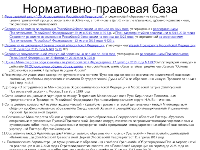 10.Соглашение Министерства общего и профессионального образования Свердловской области и Екатеринбургского епархиального управления Русской Православной Церкви о сотрудничестве по вопросам аттестации педагогических и руководящих работников, лицензирования и государственной аккредитации негосударственных общеобразовательных учреждений Екатеринбургской епархии.