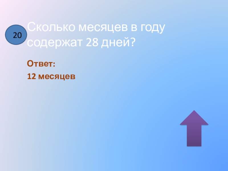 Сколько месяцев в году содержат 28 дней?Ответ:12 месяцев20