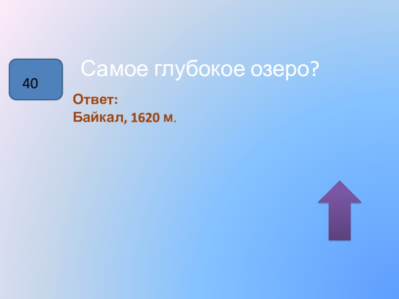 Самое глубокое озеро?Ответ:Байкал, 1620 м.40